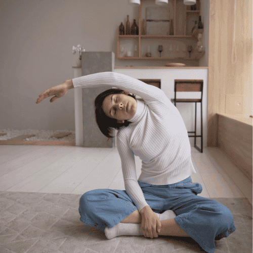 - Inclinación lateral: Con los brazos estirados hacia arriba, inclínate suavemente hacia un lado. Mantén 10 segundos y cambia de lado.